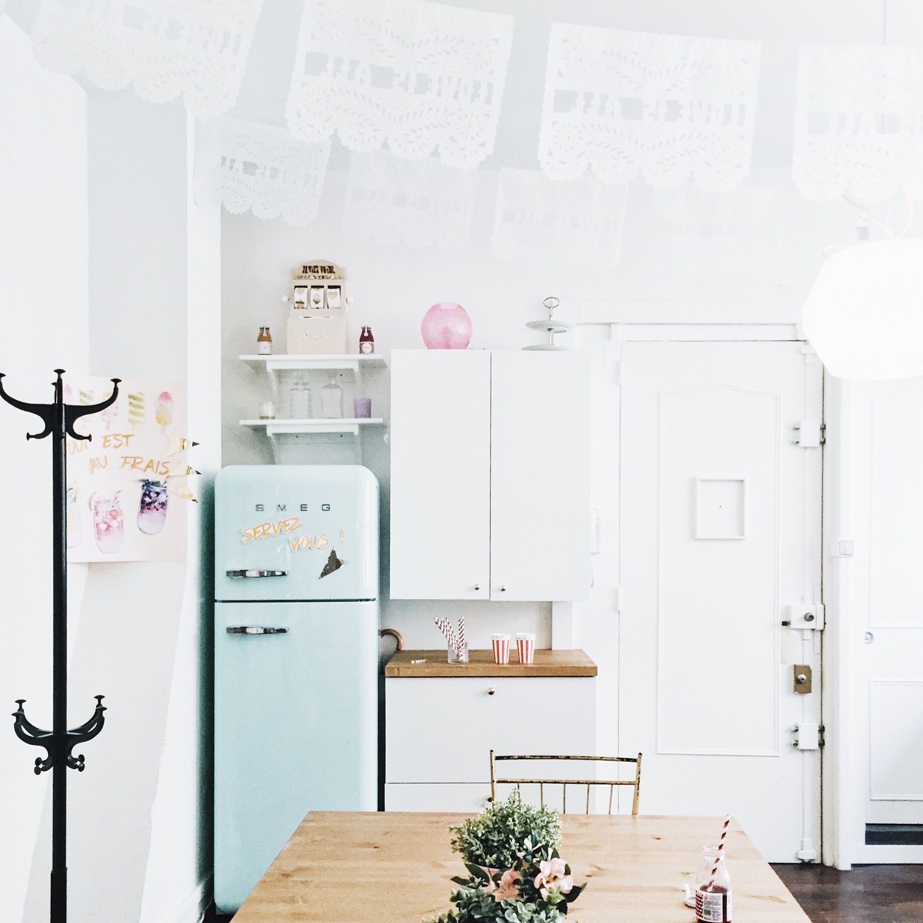 L’entrée avec notre frigo smeg d’amour <3 et tout le reste c’est du Ikea. On a mis du papel Picado au plafond car la pièce était un peu tristoune et ça change tout (ça coûte pas cher et on peut y faire écrire ce qu’on veut).