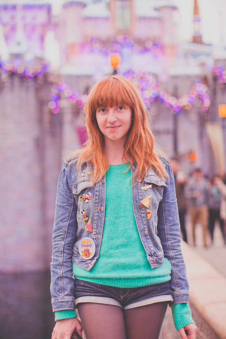 Pull et veste H&M, short Topshop, pin’s Disneyland, vernis Kiko (strawberry pink), collants Wolford, cheveux défoncés par le voyage, maquillage naturel oh yeah !