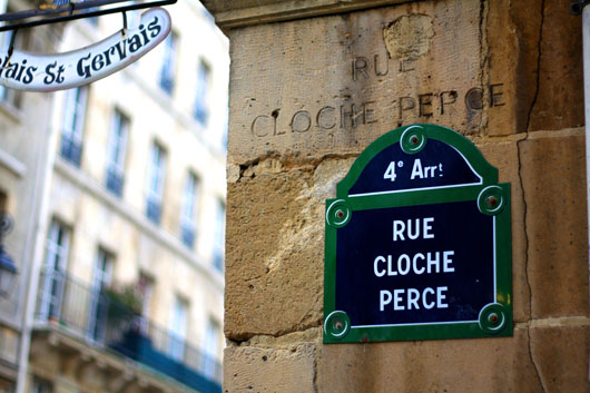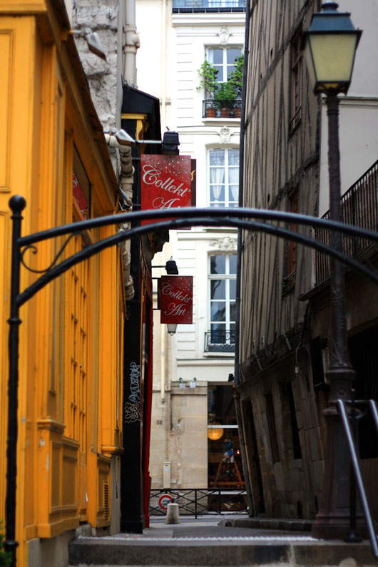Il existe une petite rue du côté de la rue de Rivoli, qui a un charme particulier. La rue de la cloche percée à d’abord un joli nom, ensuite, ses batiments inclinés, à colombages font partie des rares épargnés par Haussmann dans sa destruction massive de tous bâtiments moyennageux de Paris. Avec ses vitrines de toutes les couleurs et son escalier, je trouve qu’elle a aussi un petit côté disneyland…